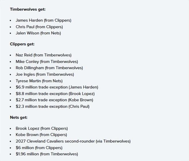 森林狼得到:哈登(來自快船)、保羅(來自快船)、威爾遜(來自籃網)