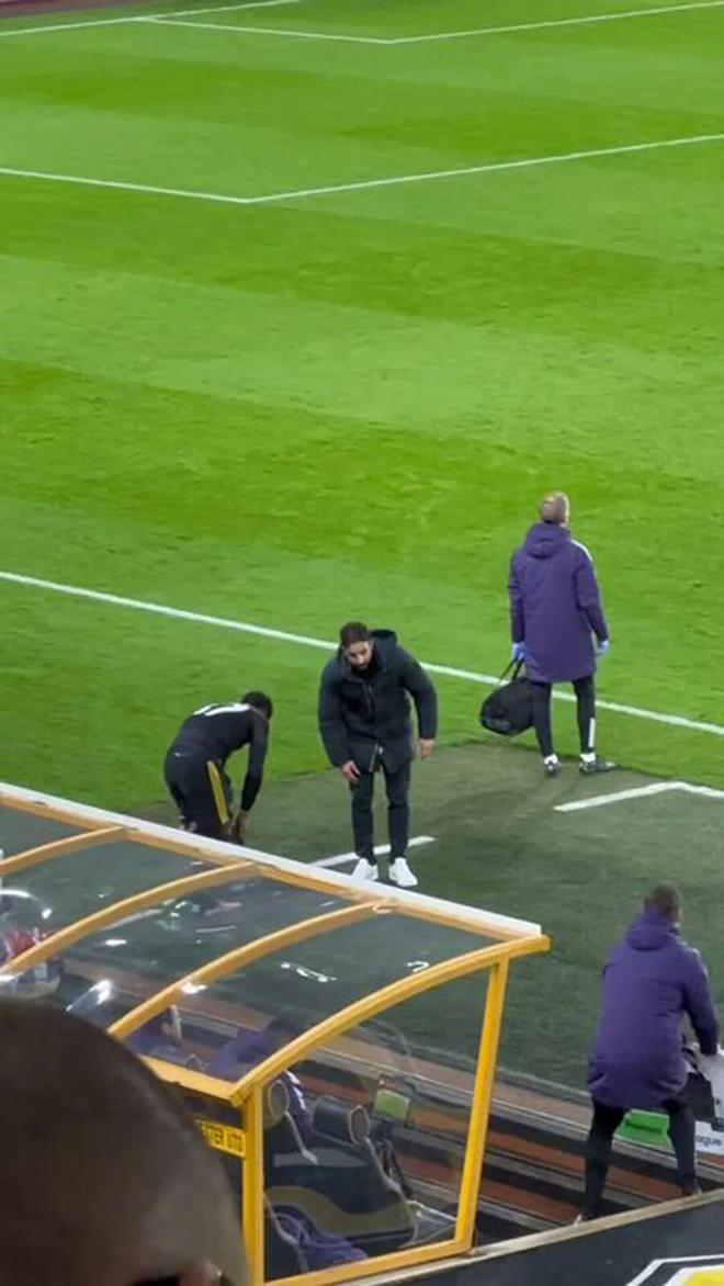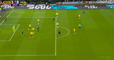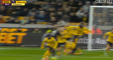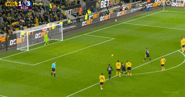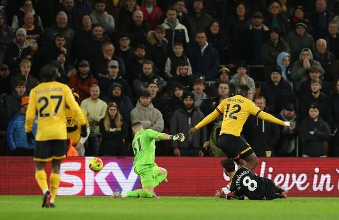 庫(kù)尼亞得球后與后衛(wèi)一對(duì)一,他選擇橫傳,但力量不足而且送到布魯諾·費(fèi)爾南德斯身后。B費(fèi)跌跌撞撞地轉(zhuǎn)身起腳,皮球穿襠門(mén)將,在補(bǔ)門(mén)的后衛(wèi)之前彈入網(wǎng)窩。曼聯(lián)1-0領(lǐng)先狼隊(duì)。狼隊(duì)球迷怒不可遏,高唱:「你們根本不配穿上這件球衣!」