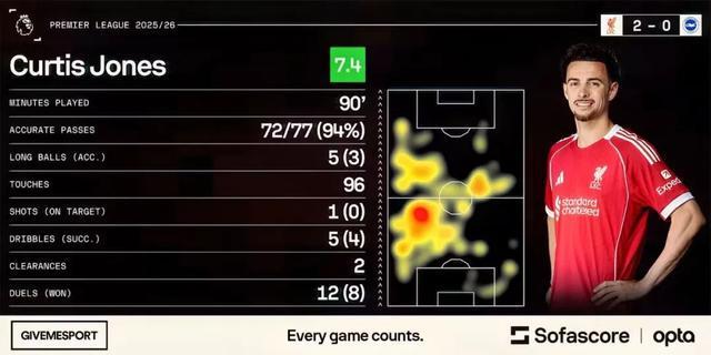對布萊頓一役,瓊斯傳球成功率94%(77傳72中),其中36次在對方半場完成;全場96次觸球,為隊內(nèi)最高;4次過人成功5次,僅被搶斷1次;防守數(shù)據(jù)同樣亮眼:2次搶斷、2次解圍、2次回收球權(quán),幾乎完美。賽后,Sofascore給他評分7.4。